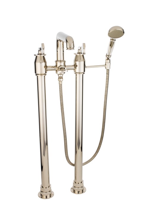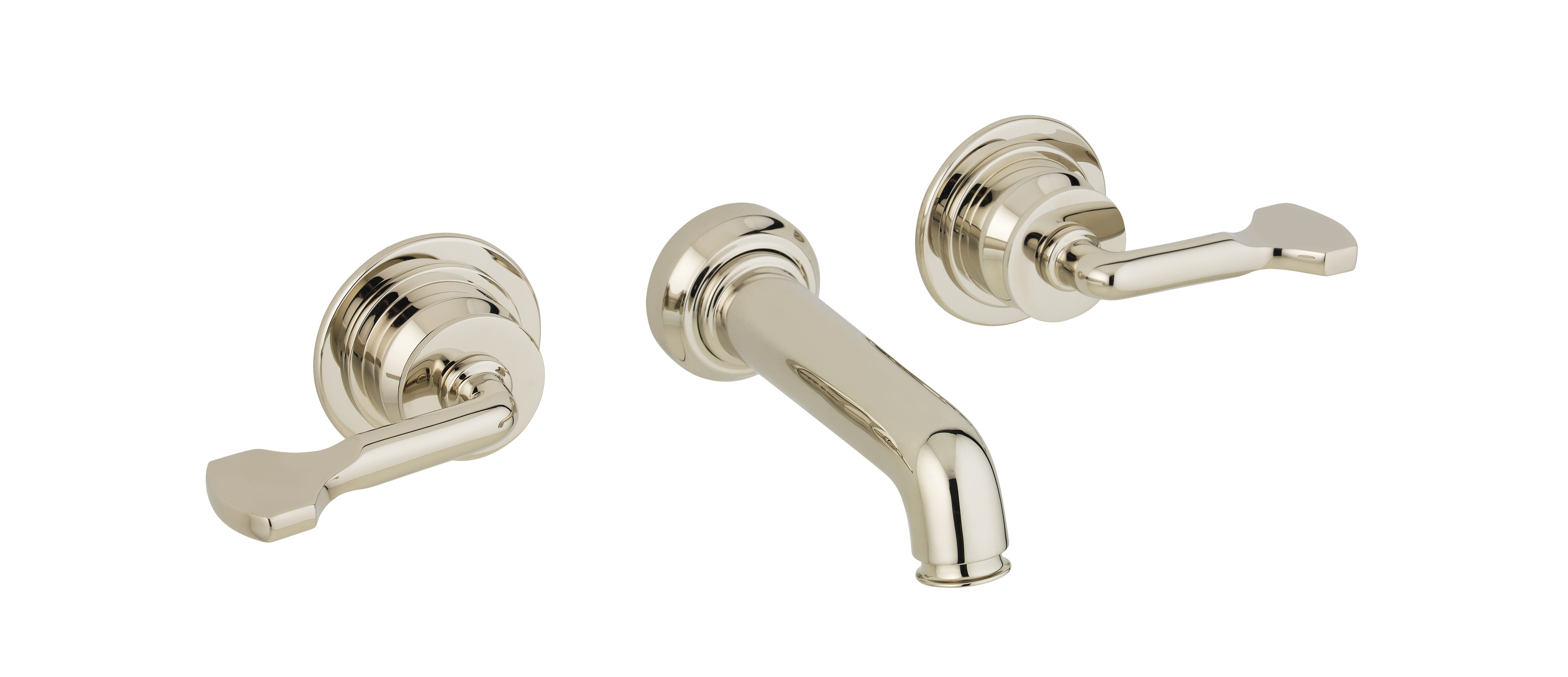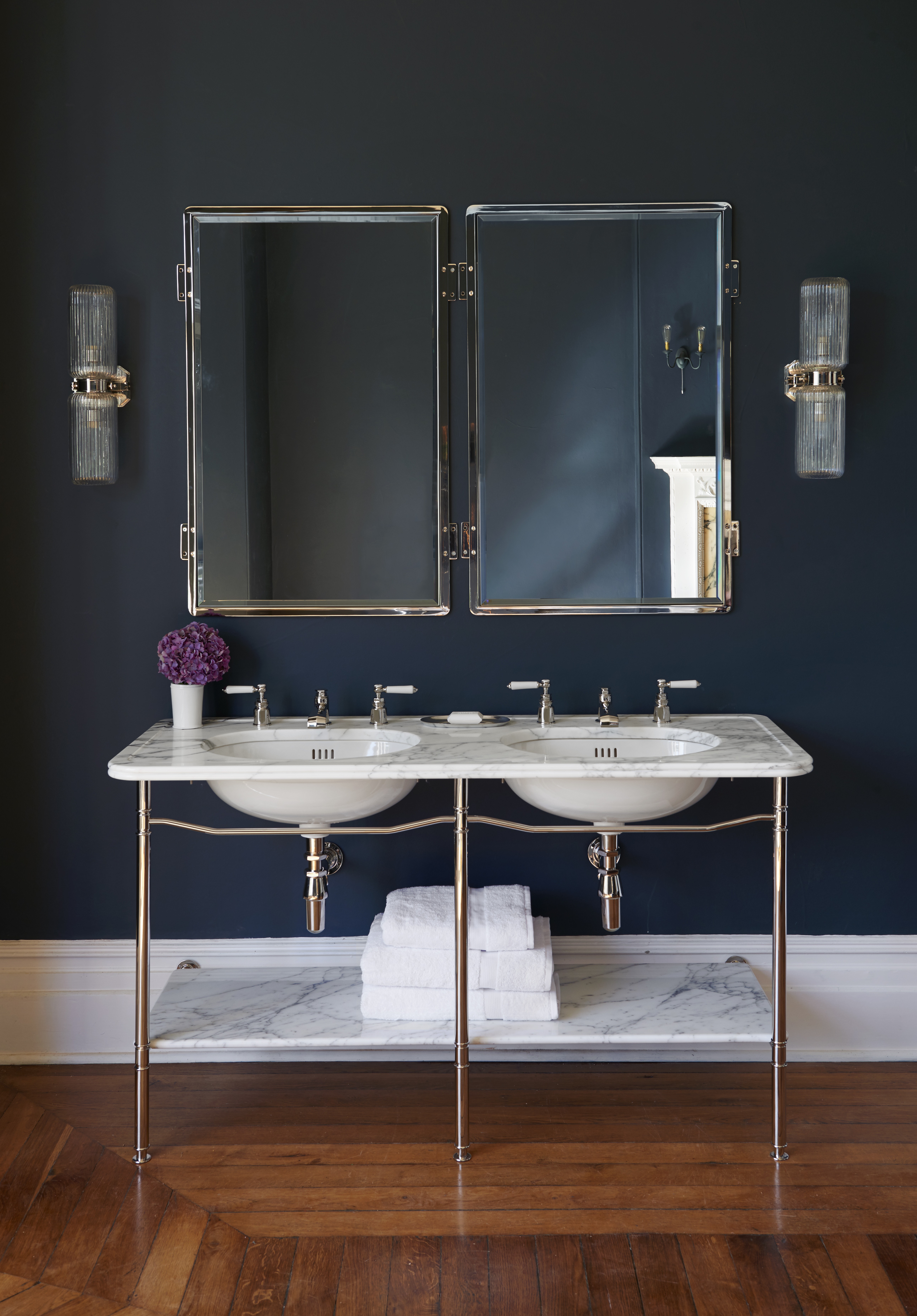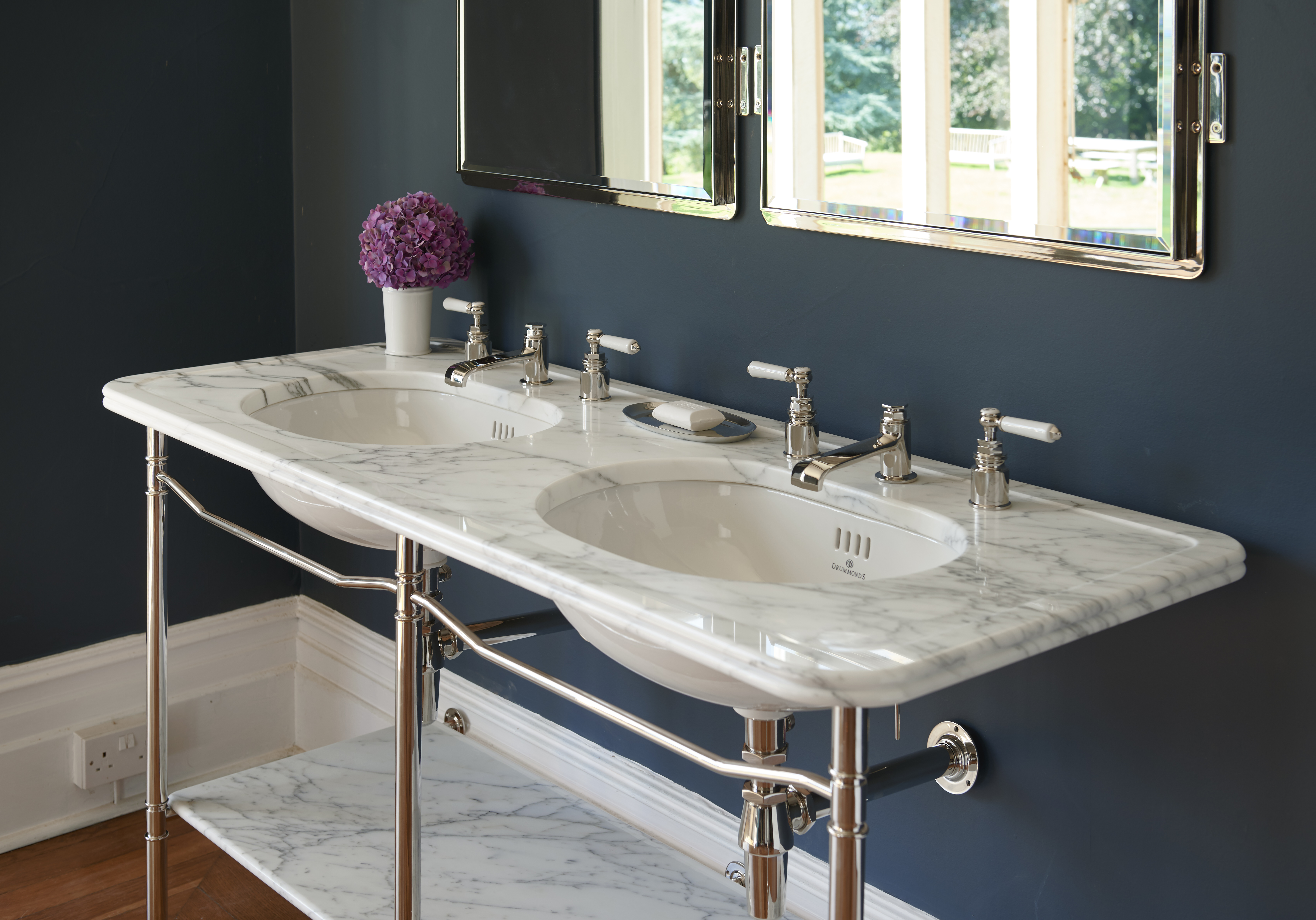 The Leawood tap and shower collection features a hallmark flattened end on the lever controls, derived by careful observation of how tools were developed to comfortably fit the human hand. Available in polished brass, polished chrome, and polished nickel, the collection includes a floor-standing bath and shower mixer, shower controls, and wall-mounted and deck-mounted basin taps. The Double Ladybower sink console features white marble, contemporary lines, good storage space, and details such as the bent towel rail.