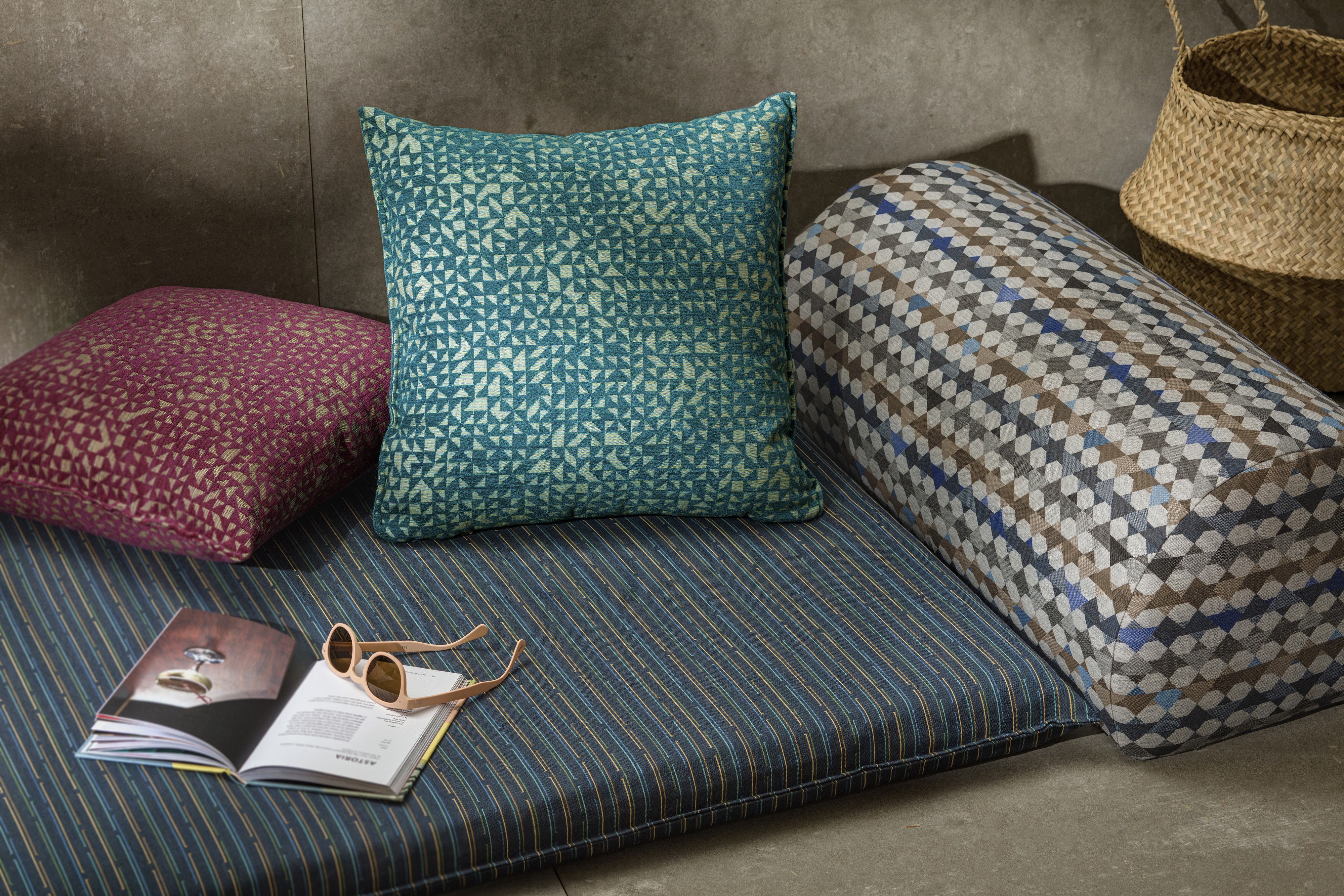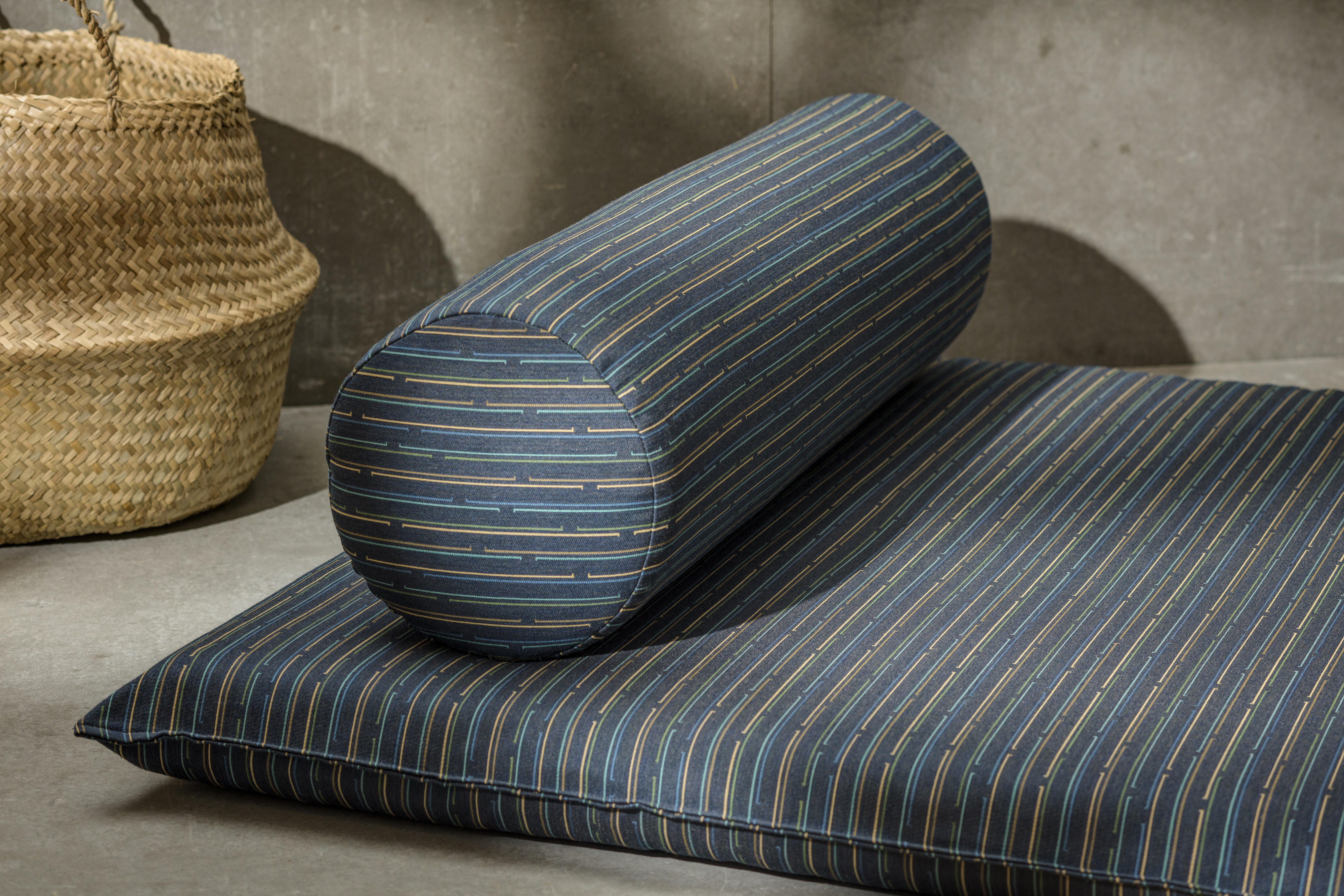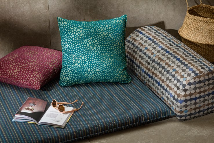 Woven in an acrylic/polyester fiber blend, the Sunbrella construction is highly UV-resistant to fading and the degrading effects of sunlight. The designs combine nautical and jewel tones complemented by warm, earthy colorways. They feature high abrasion resistance, lightfastness, mold and mildew resistance, and bleach cleanability.