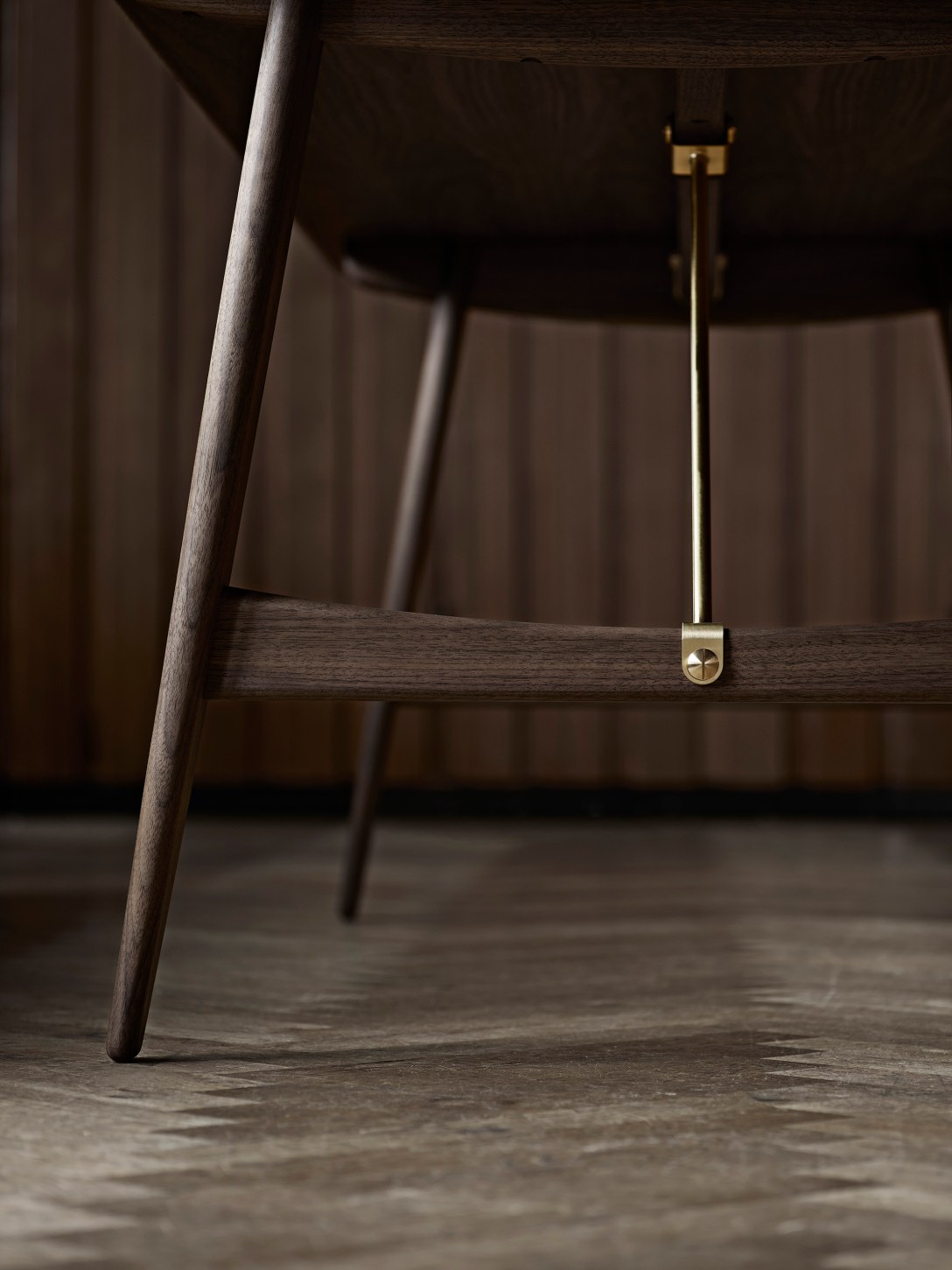 Originally designed in 1950 for an exhibition with a hunting cabin theme, the table consists of two trestles with angled legs and a slim veneer tabletop with rounded corners and edges in solid wood. Signature mortise and tenon joints on the legs are completed with wedges in contrasting wood, and the table’s stability is maximized by two diagonal brace bars mounted between the frame and tabletop.