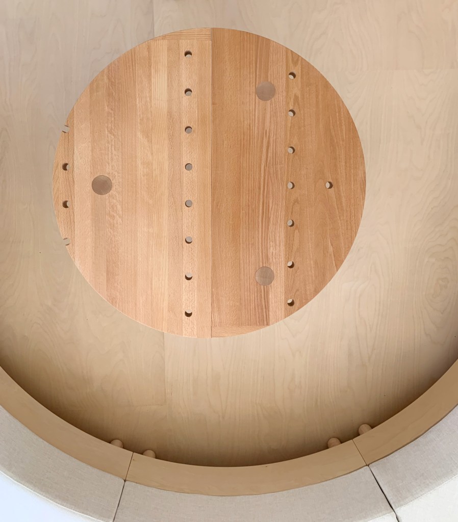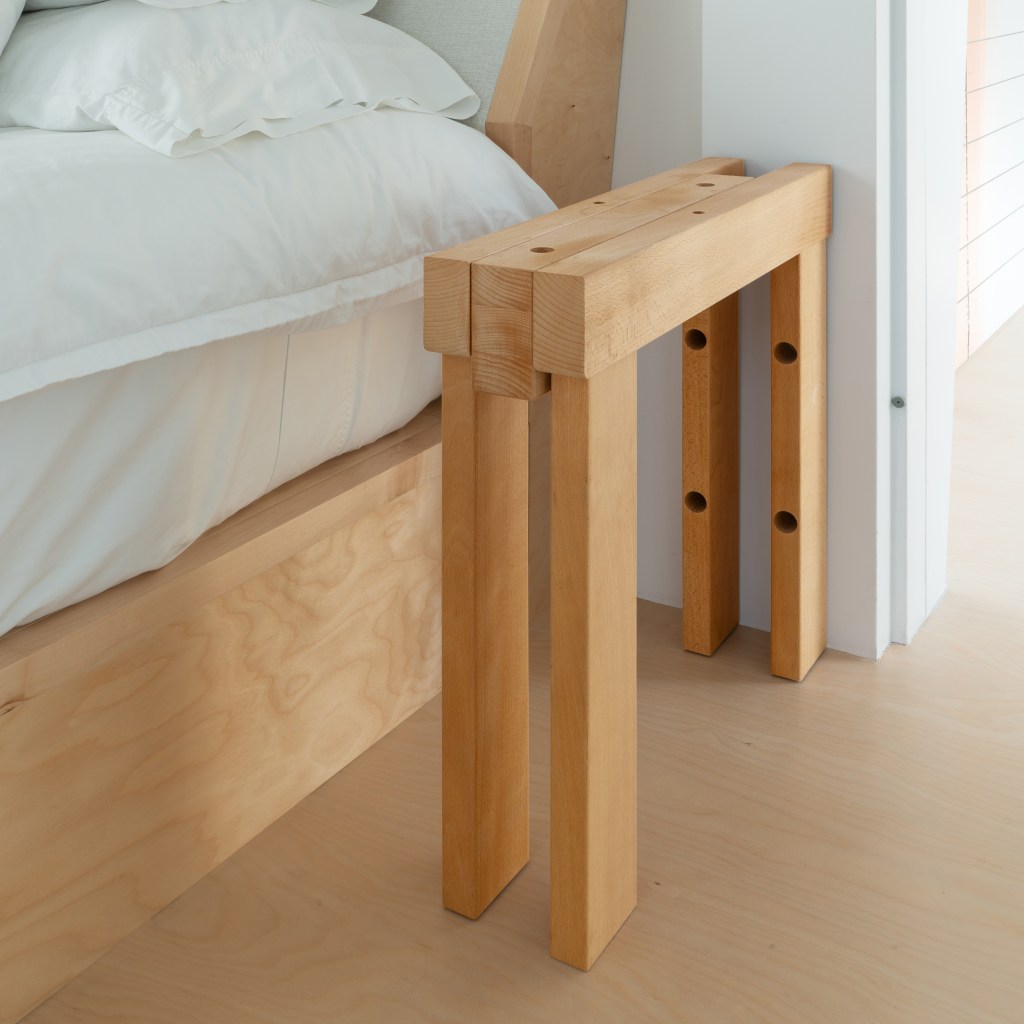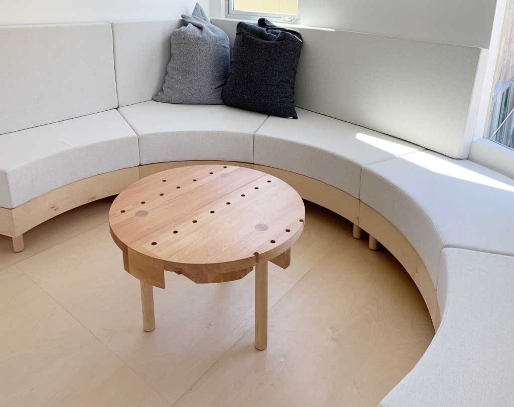 The initial offering from Eric Owen Moss Home, the A+M Collection reimagines traditional Scandinavian woodworking benches as a platform for five distinct tables for commercial and residential settings. The repurposed benches maintain the network of holes traditionally used for clamping wood and are offered with a new series of accessories — a phone stand, tablet stand, tray, storage box, storage cup, and coaster — to fill the holes. The modular tabletops are supported on new legs and come a range of shapes, including smaller bedside table.