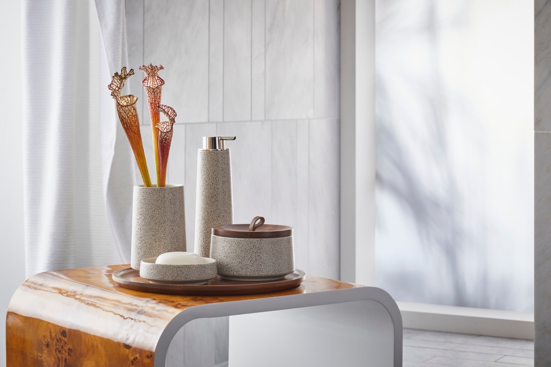The Kohler Bente Collection of bathroom storage accessories coordinates with the brand's Artist Editions Sinks. Crafted from high-quality ceramic, the collection comes in three fancily named finishes: Shagreen Ebony Pearl, Shagreen Oyster Pearl, and Sartorial White Herringbone. The five-piece set includes a soap dispenser, lidded canister, tumbler, soap dish, and nesting tray. It also comes… Continue reading Bente Collection by Kohler